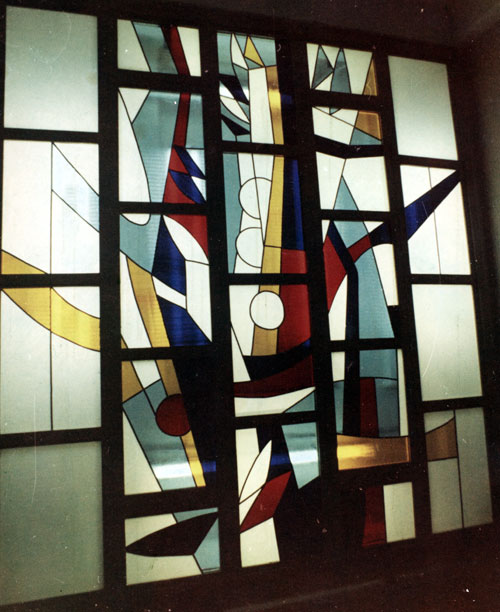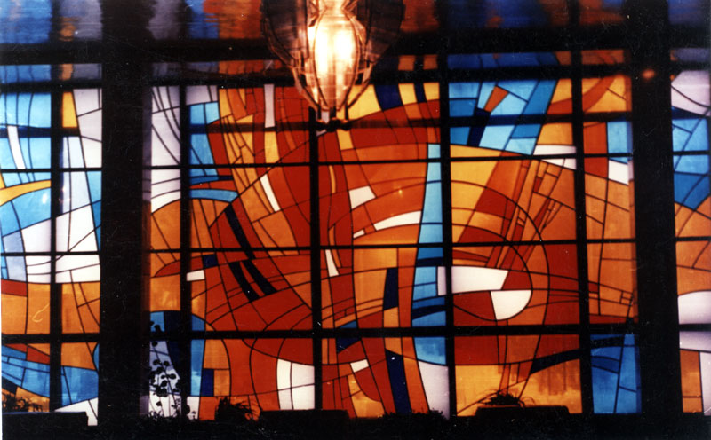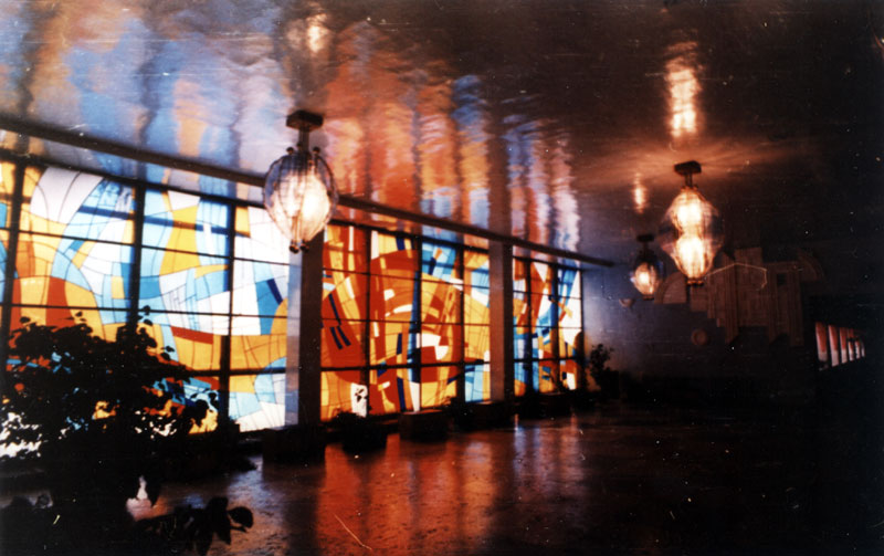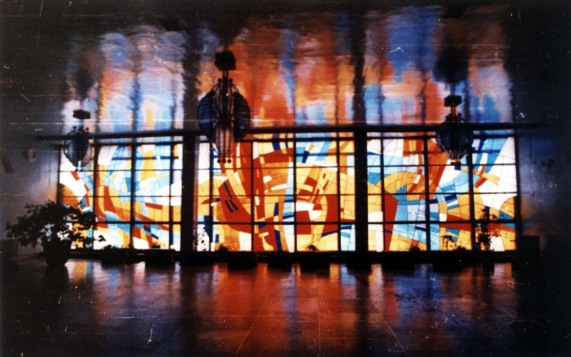 Interieurentwurf im Kulturhaus "Chemiker", Glasmalerei (Buntglas, Aluminium) im